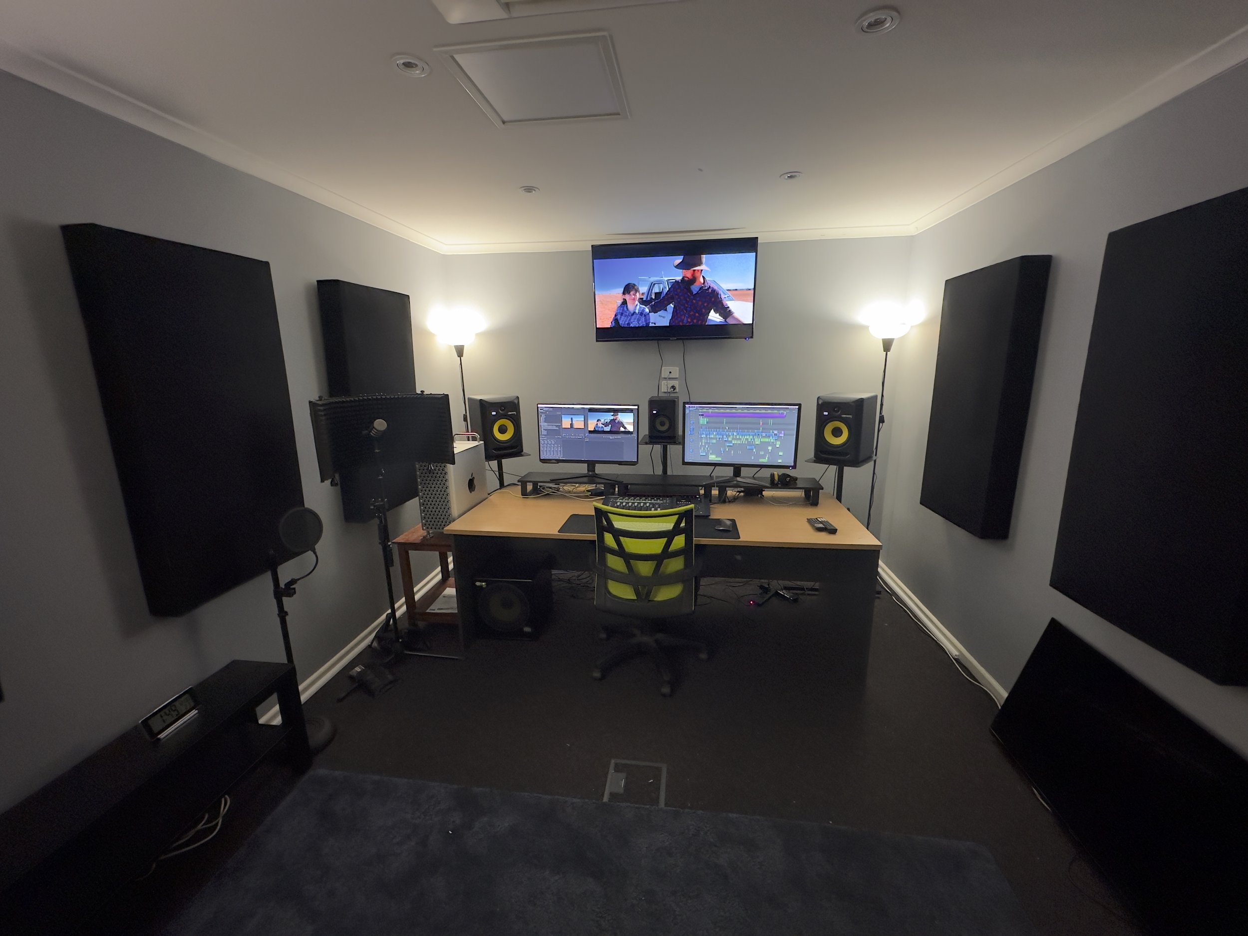 Our edit suites offers a hot desk setup with Protools, Adobe Creative Suite and DaVinci Resolve, high-end studio speakers, a broadcast-standard monitor, and a client viewing area with a 50" 4K TV. Perfect for freelance editors needing a professional environment for client reviews, sound mixing, and color grading.
