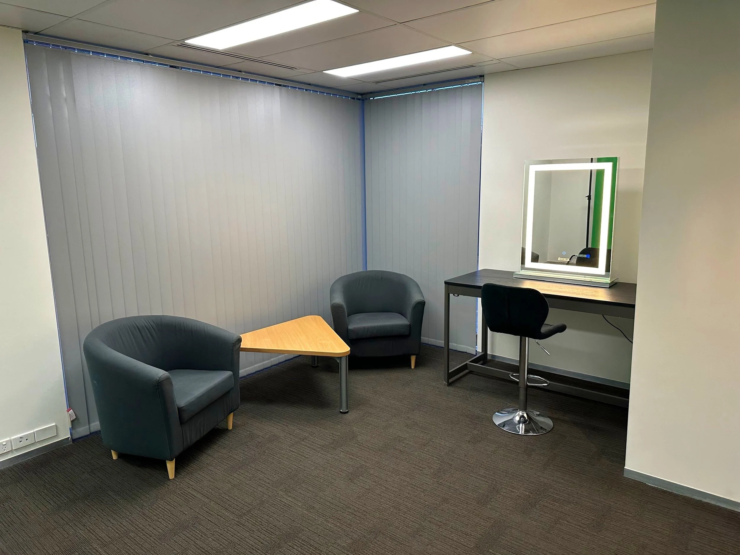 Another highlight of Studio B is the professional Hair & Makeup Station. This well-lit, spacious station is equipped with a full-size mirror, providing the perfect setup for makeup artists and stylists to work their magic. It's not just functional but aesthetically pleasing too, with clean lines and a modern setup creating a stylish backdrop for behind-the-scenes shots.